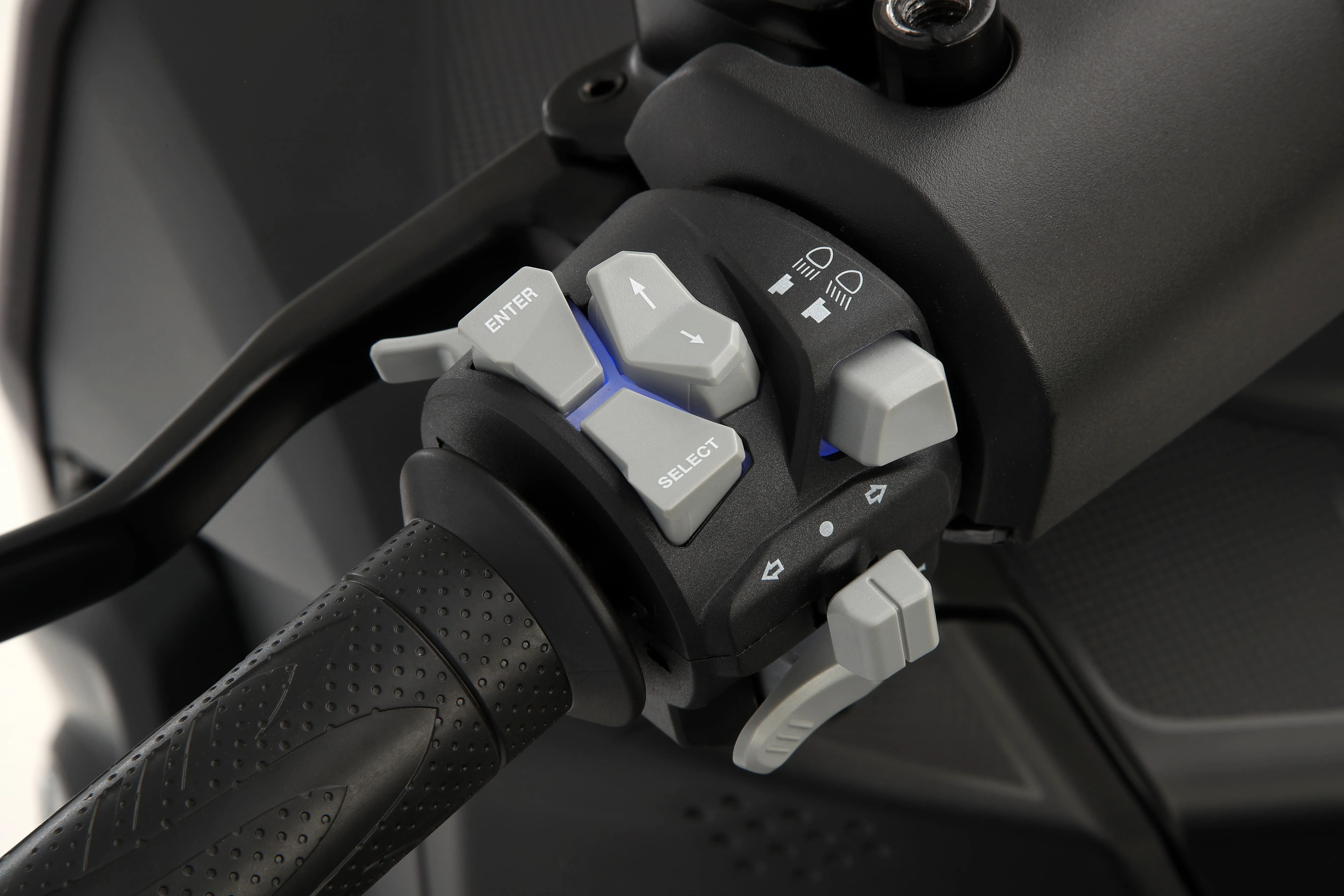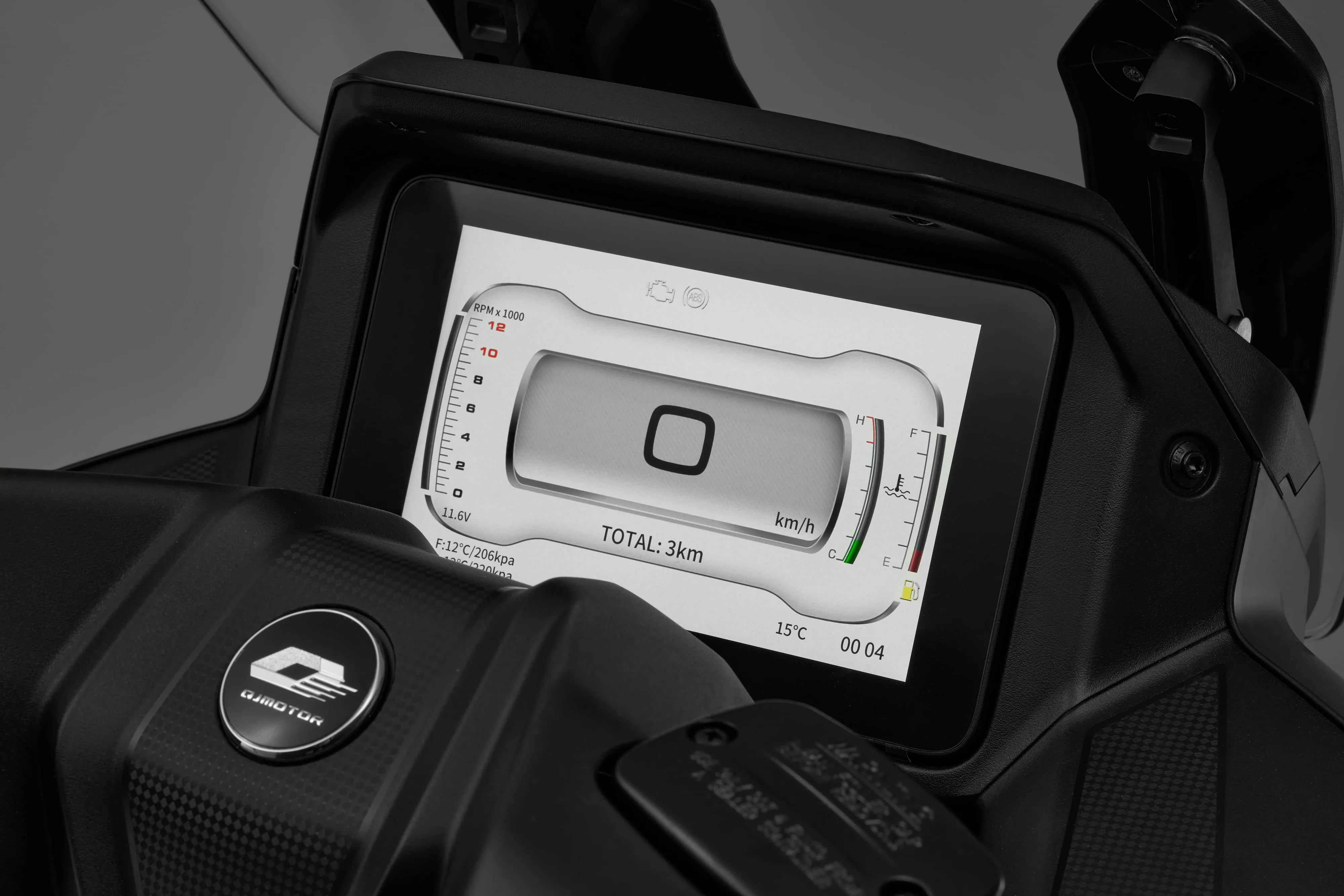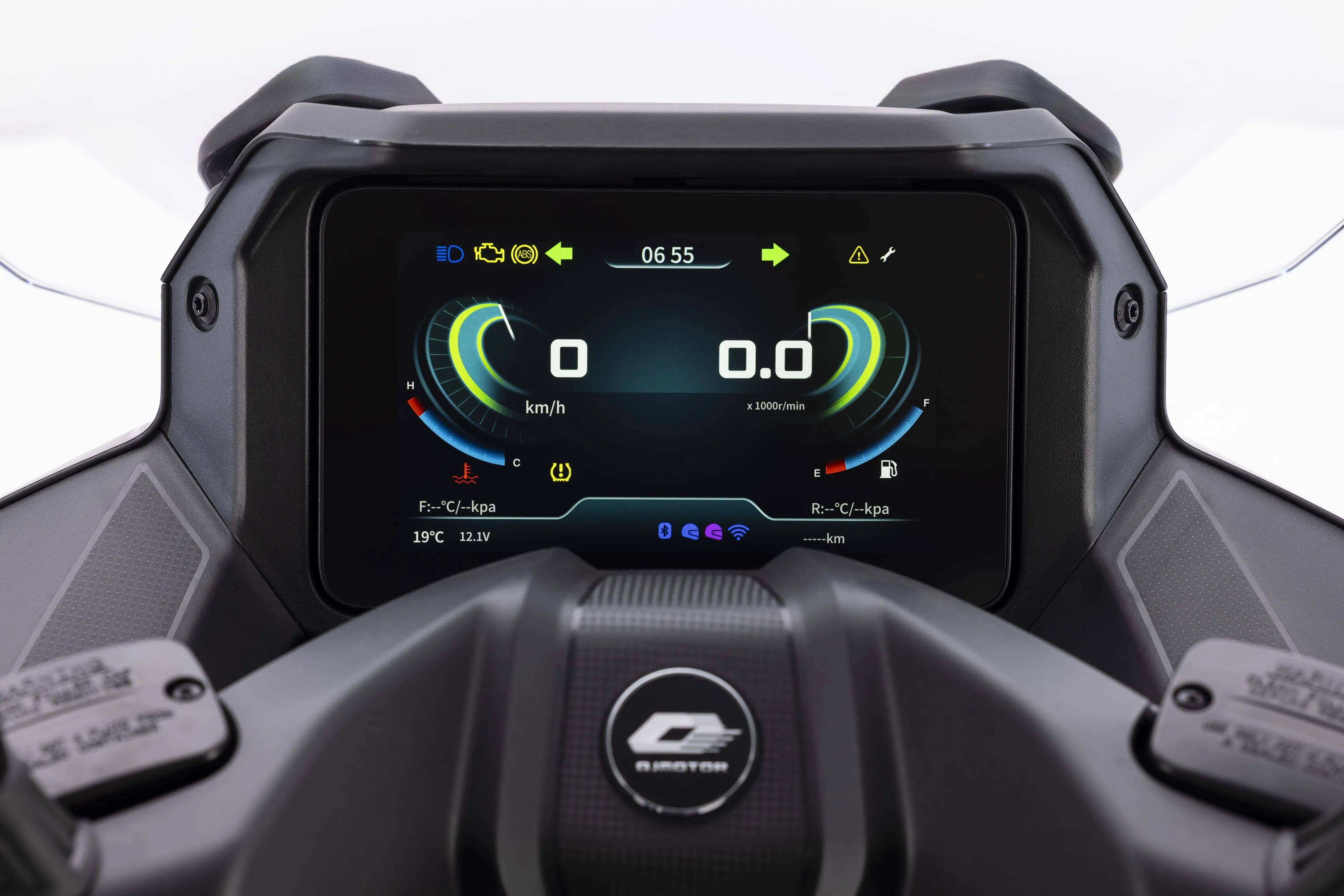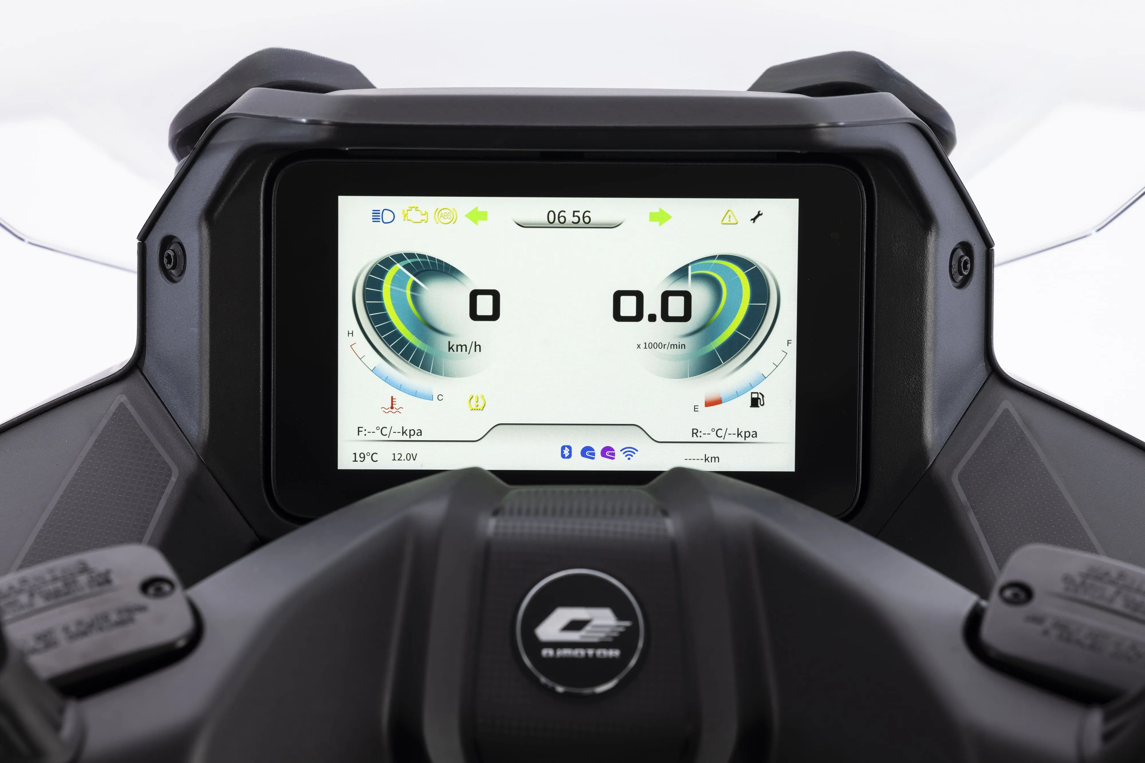 7-дюймовый TFT-дисплей с поддержкой режима разделённого экрана и встроенной навигацией. Он отличается отличной читаемостью при любом освещении и удобным управлением с левого пульта. Подключив смартфон через приложение Carbit Ride, можно одновременно пользоваться навигацией и заряжать устройство в запираемом отсеке с интегрированным USB-разъемом. Кроме того, в стандартное оснащение входит система контроля давления шинах (TPMS) — её данные отображаются прямо на приборной панели.